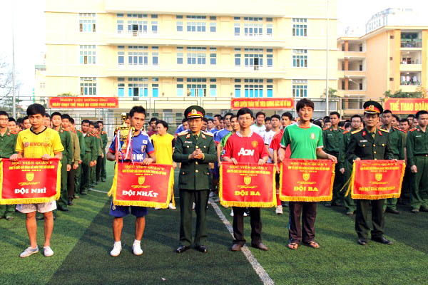 Thủ trưởng Học viện chụp ảnh lưu niệm với các đội đạt giải bóng đá thanh niên năm 2014